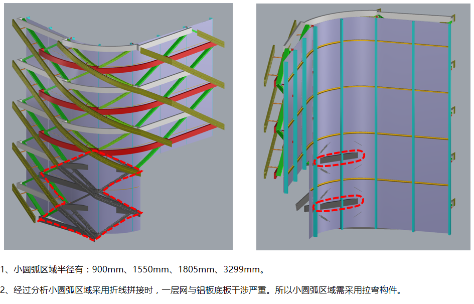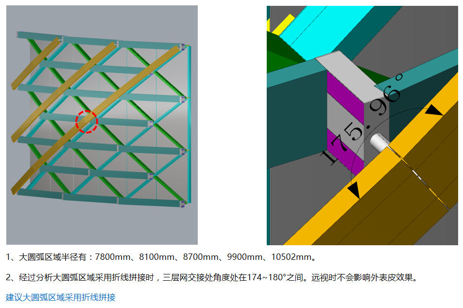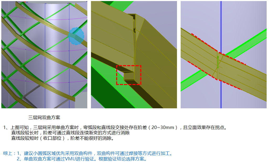 問題由此展開,將表皮重建后發(fā)現,當圓弧面半徑<3300mm時,階差最大達50mm左右,對外立面效果影響非常大,又對半徑大于3300mm位置進行對比分析后得出結論:圓弧面半徑<3300mm時,圓弧面一層網、三層網位置必須采用雙扭構件。