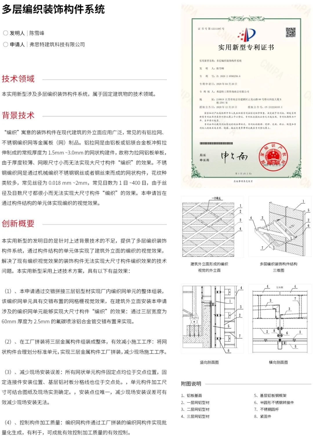 東西兩個立面被香檳色金屬編織網幕墻包裹,是本項目最大的亮點及難點,編織網幕墻系統由東西兩個立面被香檳色金屬編織網幕墻包裹,“編織”由三層鋁合金構件交錯布置來體現,同時在編織網立面內嵌櫥窗及LED,以實現更好的落地效果。
