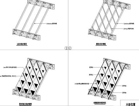 由于菱形鋁板設(shè)置了大小不等的三角玻璃,為保證菱形鋁板的平整度,針對(duì)不同的板塊加筋肋的設(shè)置數(shù)量及位置也不盡相同,針對(duì)本項(xiàng)目不同類型的板塊設(shè)計(jì)了加筋肋的形式,以保證板塊的平整度。