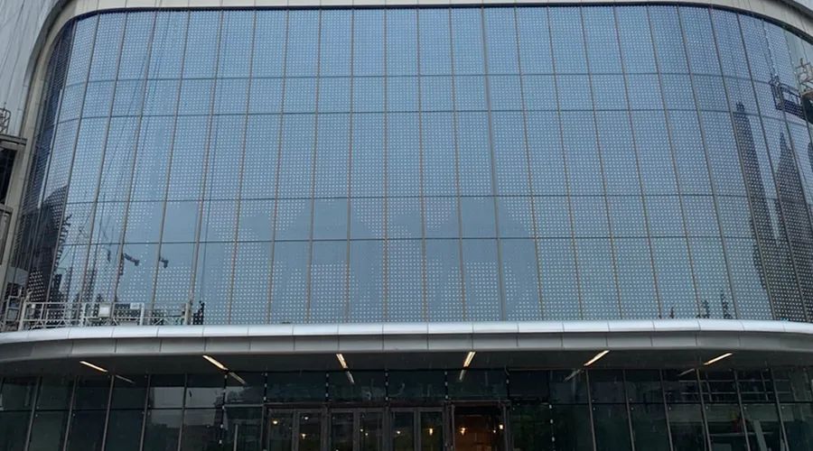 主入口玻璃幕墻,玻璃與墻面間距90mm,玻璃側(cè)設(shè)置低密度屏,玻璃幕墻內(nèi)側(cè)設(shè)置2mm 厚穿孔鋼板(粉末噴涂,背襯)。在梁間設(shè)置檢修通道,供人員進(jìn)入對(duì)燈光進(jìn)行檢修。非低密度屏區(qū)域在墻體上背襯1.5mm厚壓型鋼板。