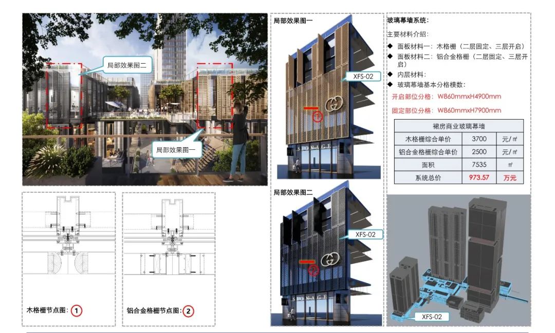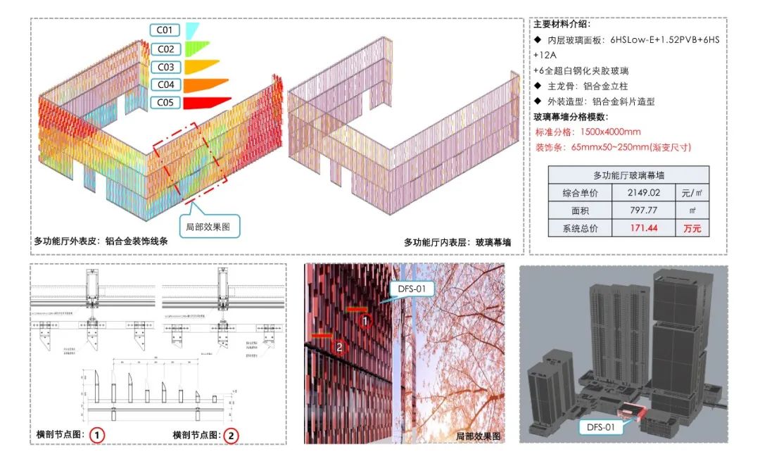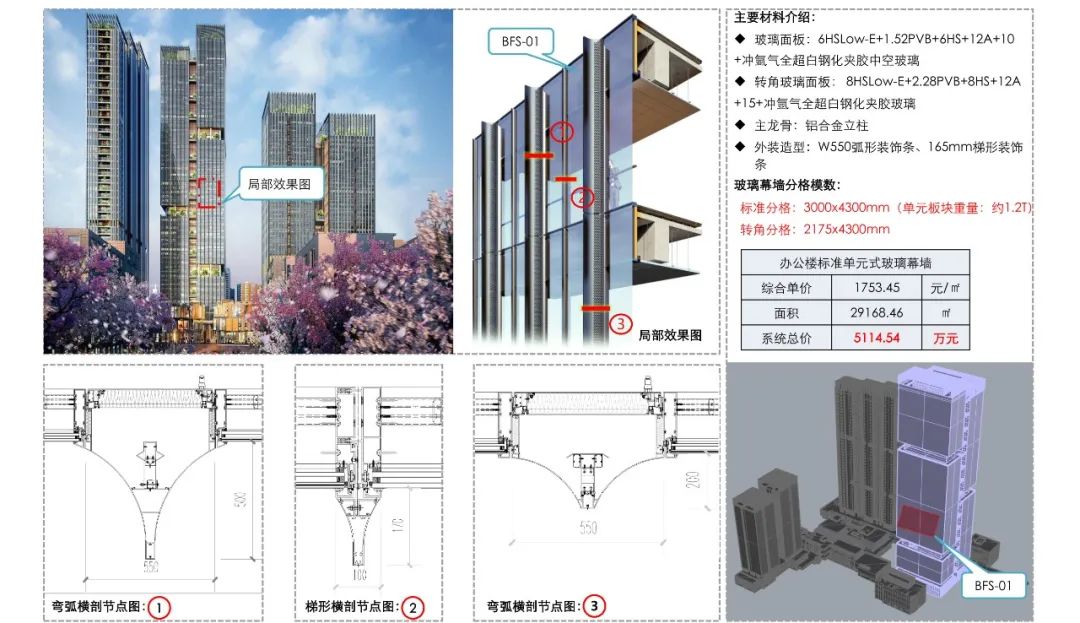 項(xiàng)目通過(guò)與建筑師業(yè)主的充分溝通,了解其項(xiàng)目需求,再根據(jù)具體實(shí)際情況不斷的迭代優(yōu)化設(shè)計(jì),最終達(dá)到建筑師及業(yè)主想要的效果。從建筑定稿到出圖時(shí)間只有一周,滿足了業(yè)主的招標(biāo)時(shí)間節(jié)點(diǎn),并且通過(guò)不斷的優(yōu)化,在不影響立面效果的前提下使幕墻成本合乎業(yè)主心中的要求。
