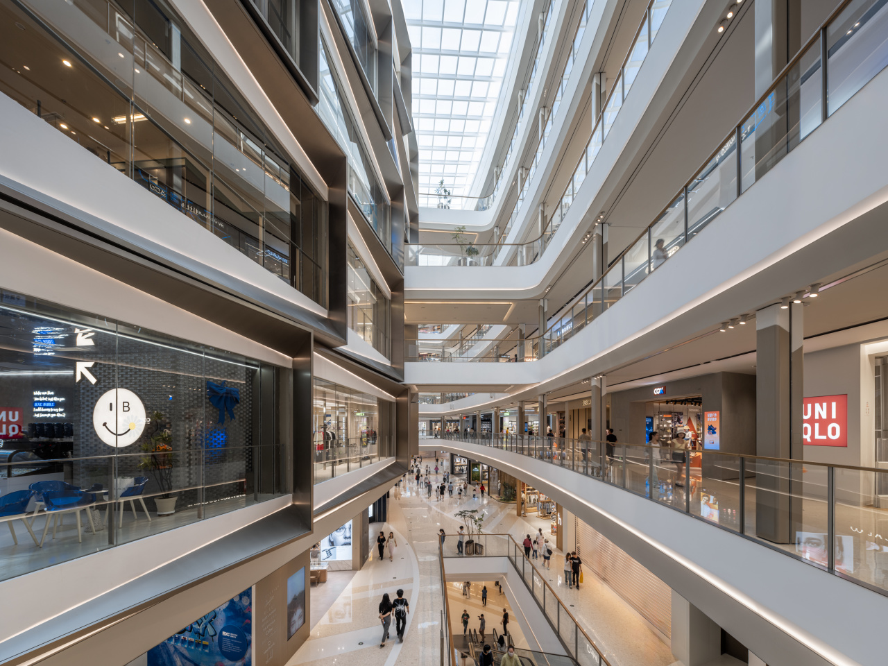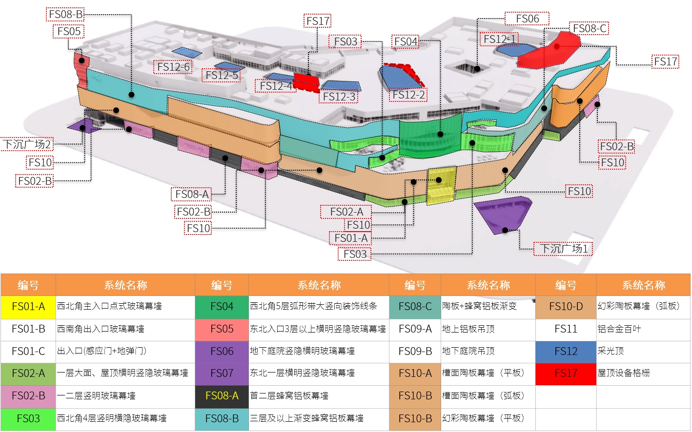 幕墻形式包括:點(diǎn)爪玻璃幕墻、框架式玻璃幕墻、框架式鋁板幕墻,玻璃欄桿、鋁合金通風(fēng)百葉、鋁板雨蓬、不銹鋼雨蓬、穿孔板幕墻、鋁合金格柵、鋁板星空頂、采光頂、鋁網(wǎng)幕墻系統(tǒng),凹槽陶板系統(tǒng)、幻彩陶板系統(tǒng)、材料種類繁雜,總計(jì)采納了19種不同類別的幕墻與裝飾材料,每一種均選材講究,工藝精湛,共同構(gòu)筑起這座商業(yè)綜合體的非凡外衣。