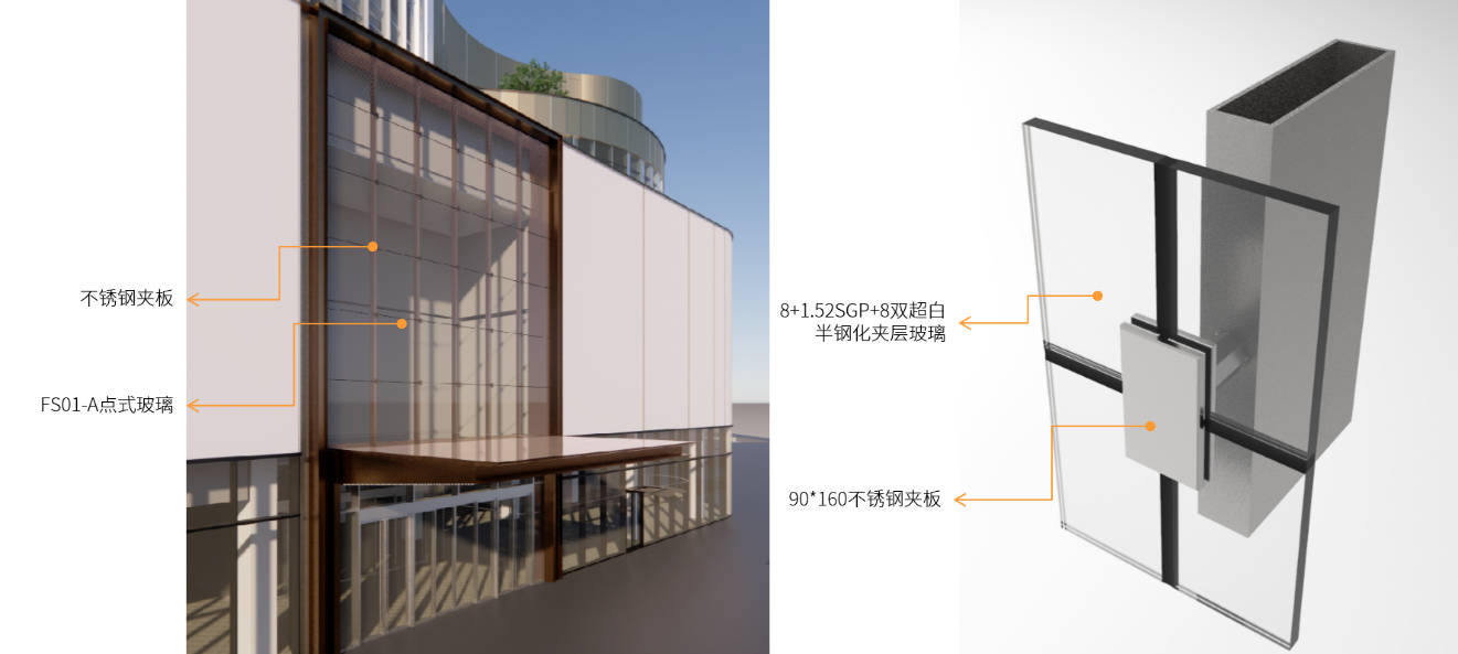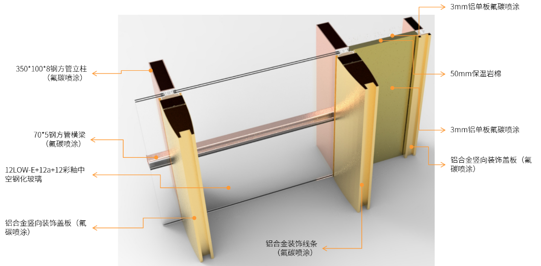 前期,經(jīng)與業(yè)主及方案公司針對(duì)項(xiàng)目的亮點(diǎn)進(jìn)行多次溝通,明確了項(xiàng)目特色與外觀訴求,細(xì)致研究幕墻外立面特性后,提供了比選方案文件?;诰C合評(píng)估,最終敲定了幕墻材質(zhì)與構(gòu)造連接方案。以下為主要幕墻系統(tǒng)設(shè)計(jì)概述。