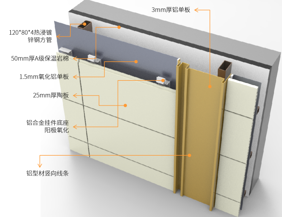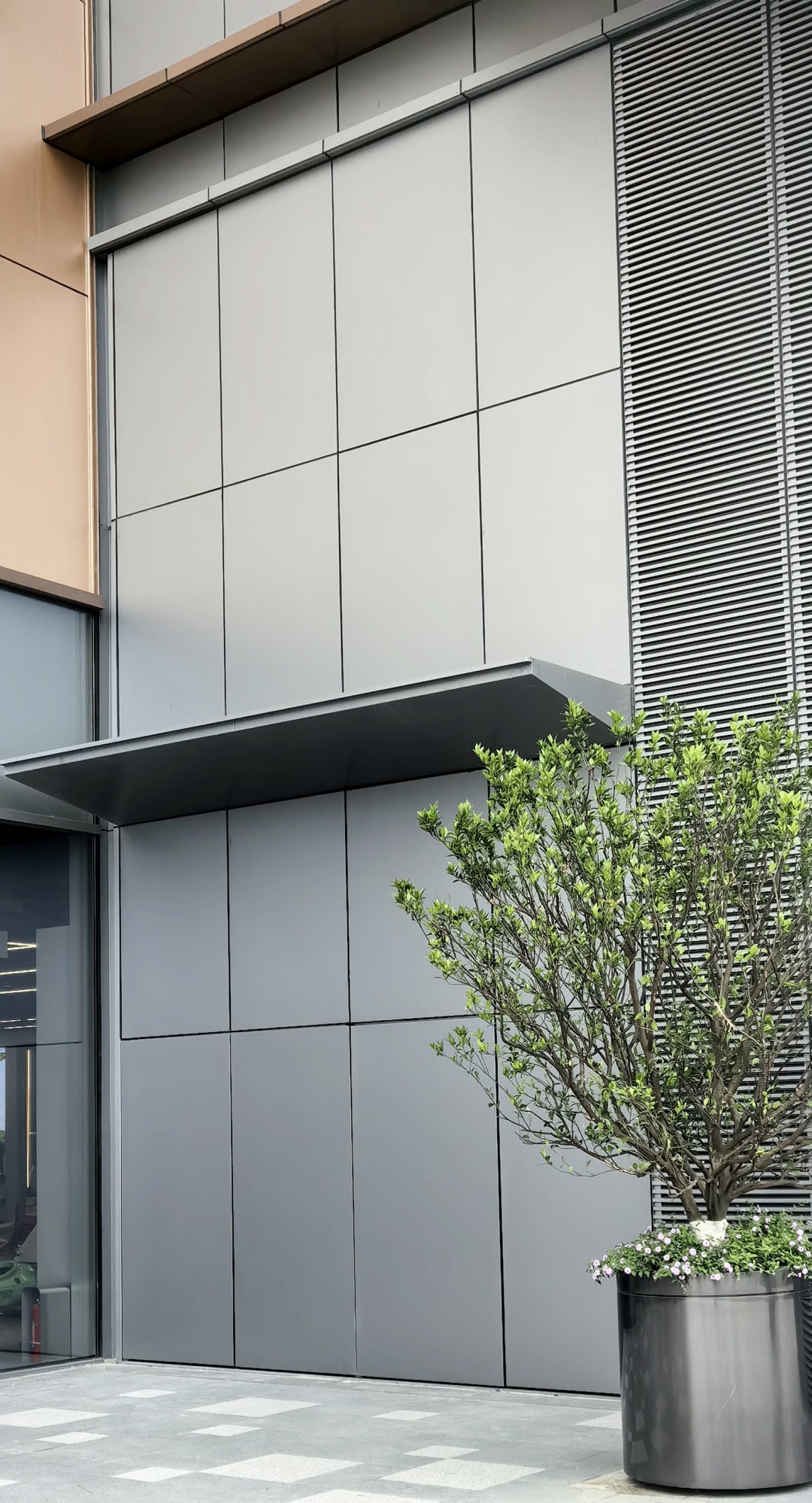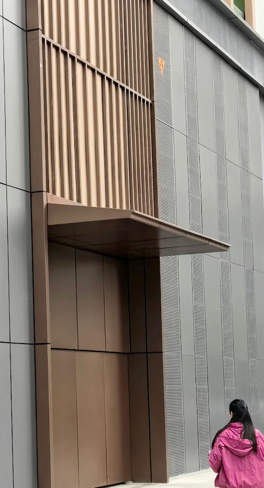 位于北立面與西立面的陶板+鋁板漸變幕墻系統(tǒng),采用抽槽鋁板(寬度漸變)及炫彩陶板的組合,在不同的位置,給人視覺(jué)的享受,提供豎裝和橫裝等多種安裝方式。