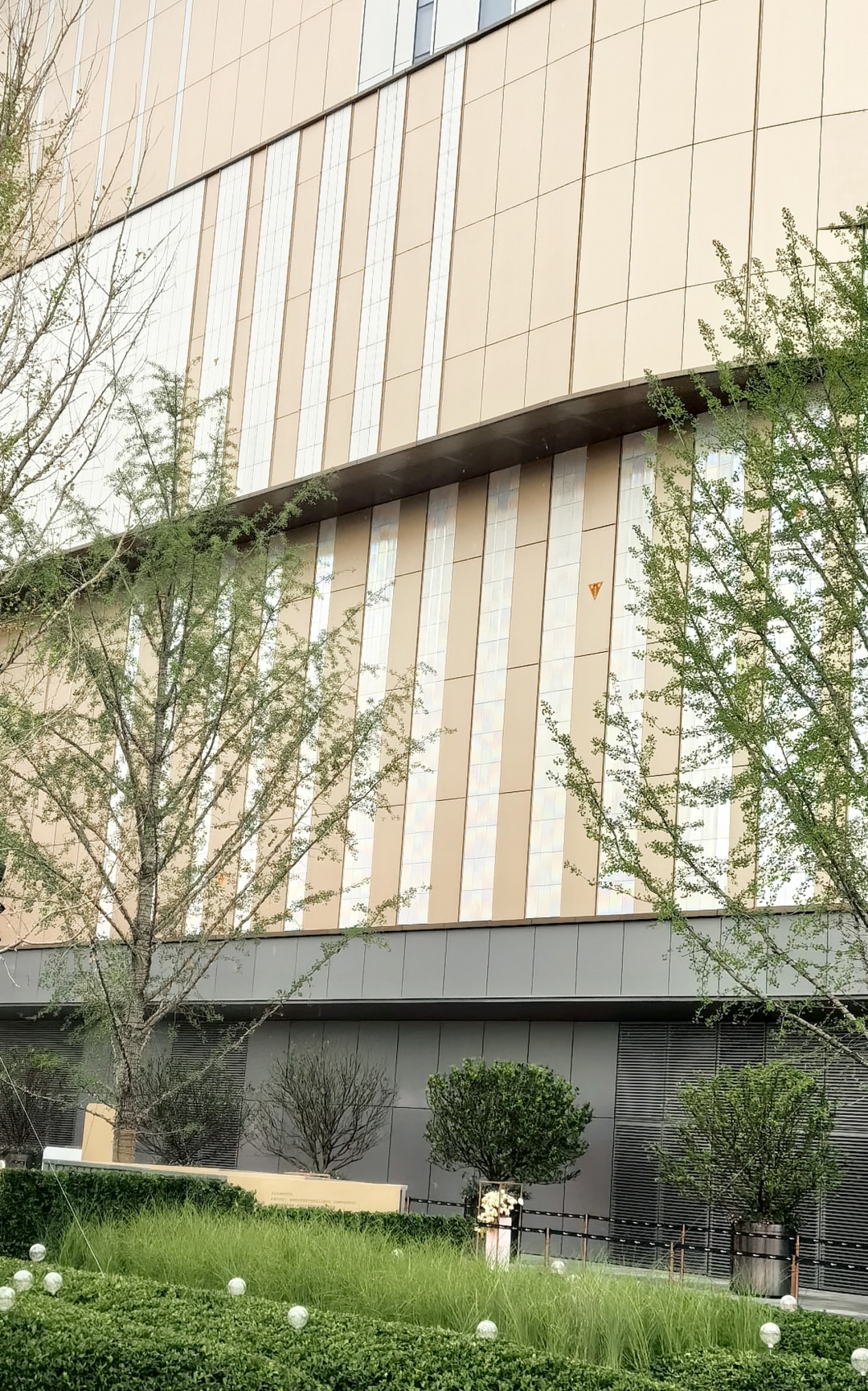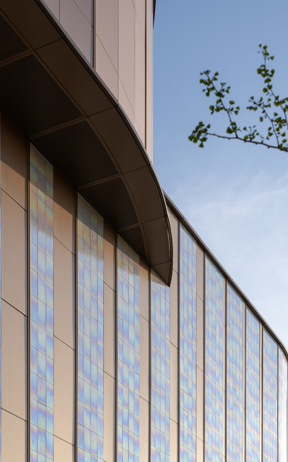 存在于各個(gè)立面的三層以上的漸變鋁板幕墻,采用錯(cuò)落有致的蜂窩鋁板分布排列,根據(jù)不同的顏色(金色與銀灰色)交織,宛如流光溢彩的飄帶,賦予建筑輕盈靈動(dòng)之姿。