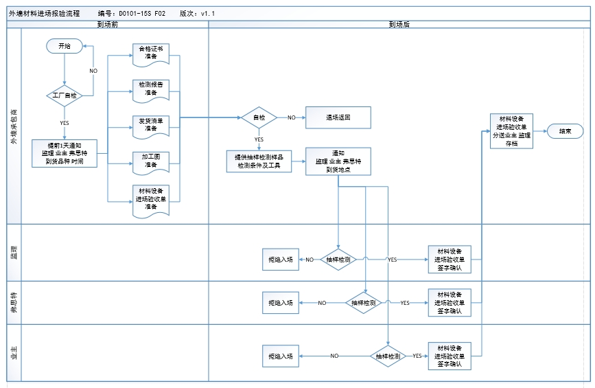 材料的控制是安裝的根本,控制好材料的進場時間是項目順利完成的重要保障。通過對材料進場質(zhì)量、材料復(fù)檢計劃、材料封樣進度、材料復(fù)試內(nèi)容、主輔材加工進度及進場進行全方位把控,進行材料質(zhì)量管理。