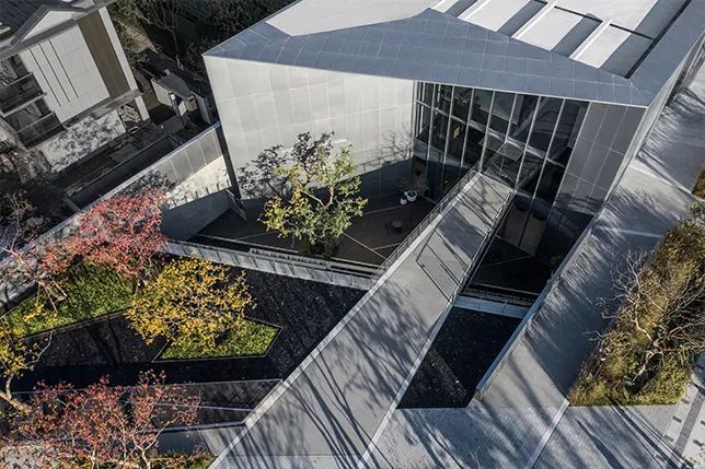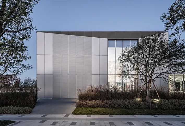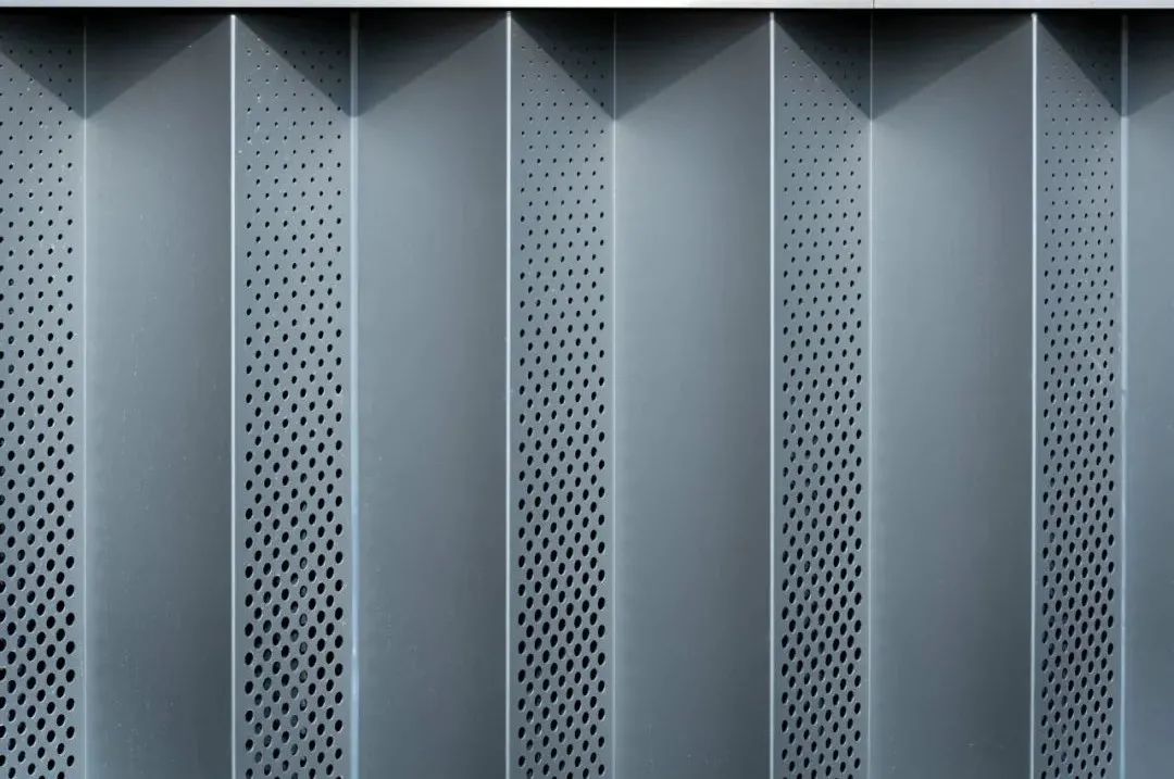 南立面主入口借助穿孔鋁板幕墻系統(tǒng),厚重的實(shí)墻面、通透的玻璃體、半透的穿孔鋁板幕墻形成強(qiáng)烈的對(duì)比,三者相輔相成,相互穿插,使得建筑立面生動(dòng)豐富。