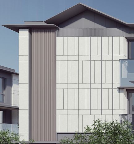 聯(lián)排產(chǎn)品的立面設(shè)計(jì)更加極致的強(qiáng)調(diào)了建筑的橫向舒展性,以精致的工藝處理建筑的橫向挑板,加之橫向的玻璃欄板,讓建筑變得更加優(yōu)雅與精致,極大的提升建筑的品質(zhì)感。陽(yáng)臺(tái)位置欄桿為外掛,玻璃無(wú)斷縫,整體性好,陽(yáng)臺(tái)梁內(nèi)側(cè)涂抹深色涂料,玻璃局部彩釉處理。