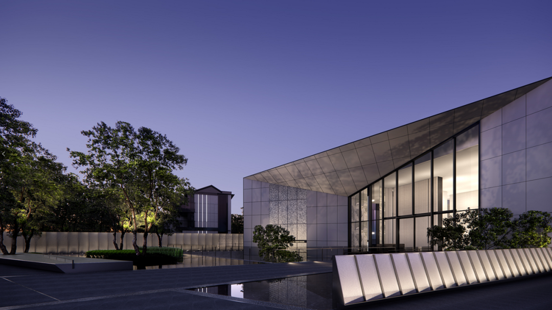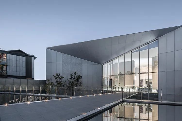 東西山墻面采用錯(cuò)縫石材,豎向100mm寬金屬線條加以修飾,搭配以20x100mm鋁合金格柵。在架構(gòu)鮮明主題感、價(jià)值感的同時(shí),又彰顯現(xiàn)代雅致的魅力。