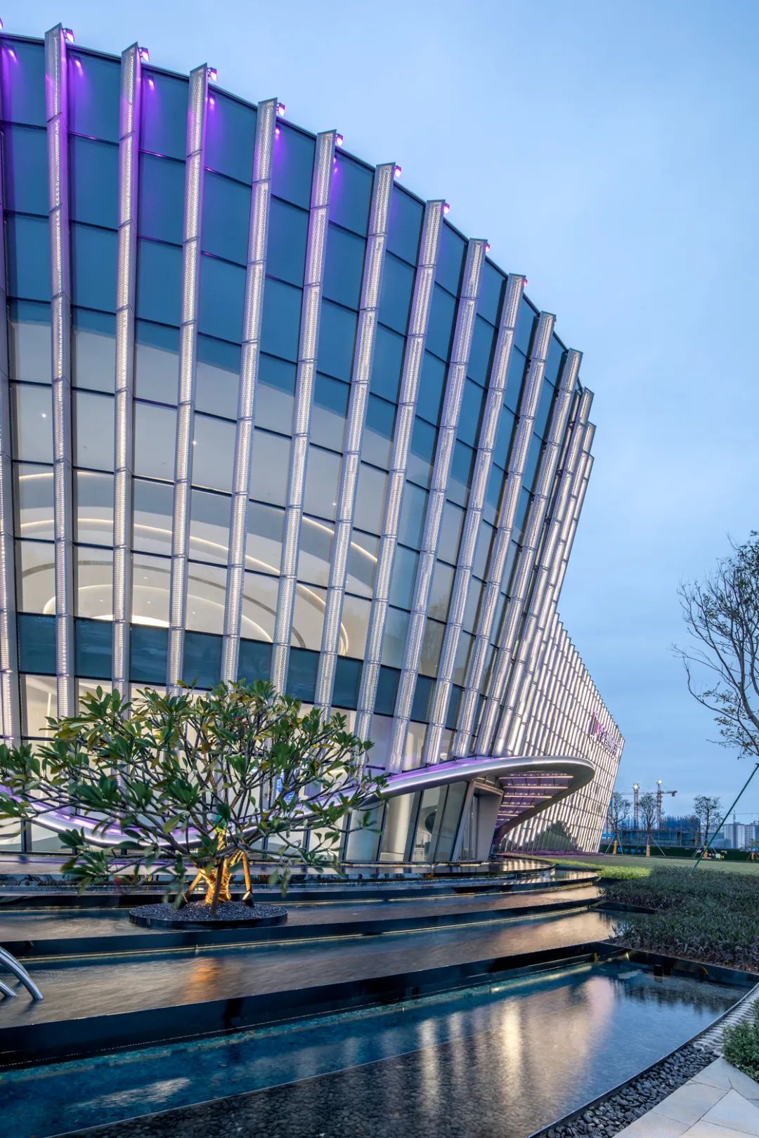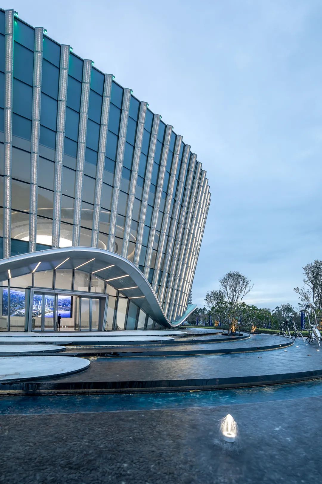 緩慢步入示范區(qū),迎面而來的建筑主體外形律動,好似踏浪而來,給人以震撼的視覺感受。主立面通體玻璃幕墻簡潔大氣,明亮通透,細長裝飾線條挺立排布,于光線照射下熠熠生輝,呈現(xiàn)粼粼波光。海浪制式的入口雨棚,更與整體設計理念相融相生,貫穿海洋之城的藝術美學。
