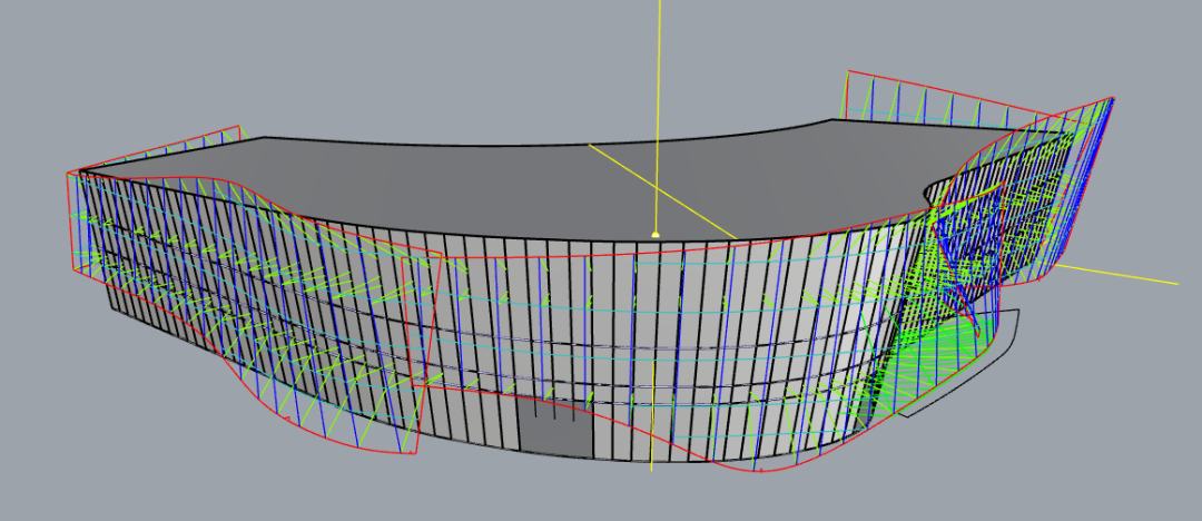 經(jīng)過多方計算,配合協(xié)作確定,最終初步方案不能滿足實際需求,并由一張手繪圖拉開第二版方案的序幕。新方案將雙層玻璃幕墻改成了單層幕墻,其設計的核心重點在于——豎向線條造型的實現(xiàn)。