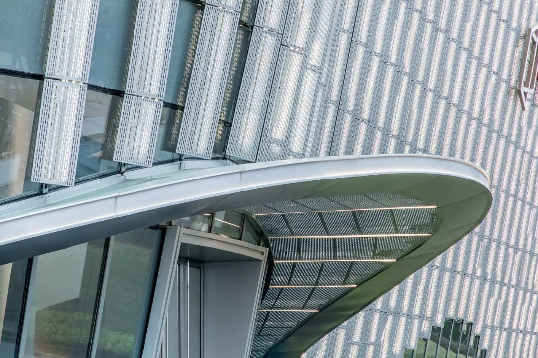 另外,在項目主入口處飄帶雨棚的設計中,結合檐口的鋁板造型上下起伏,呈現(xiàn)較大幅度的彎弧曲線,拼接處的細節(jié)處理與主體間的交接過渡細致入微。雨棚上部面板為玻璃,下部面板采用穿孔鋁板,營造通透的實際效果,同時在燈光投射下,迷離變幻,與整個建筑主體合二為一,精準表達項目的設計理念。