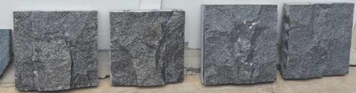 材料選擇:選用深灰色斧鑿面進(jìn)口巴西黑石材,斧鑿面自然效果以及天然石材的沉淀與大堂強(qiáng)調(diào)的野奢風(fēng)完美匹配。飾面采用一定比例清漆噴涂,提升質(zhì)感,強(qiáng)化視覺(jué)效果。