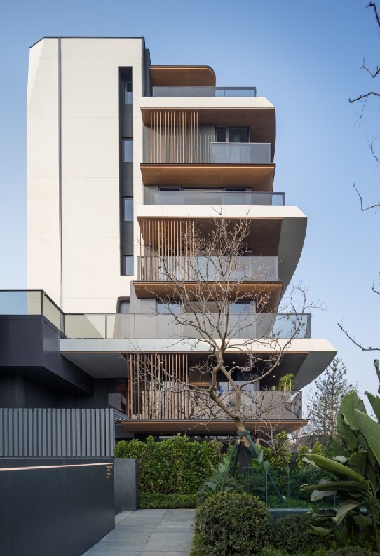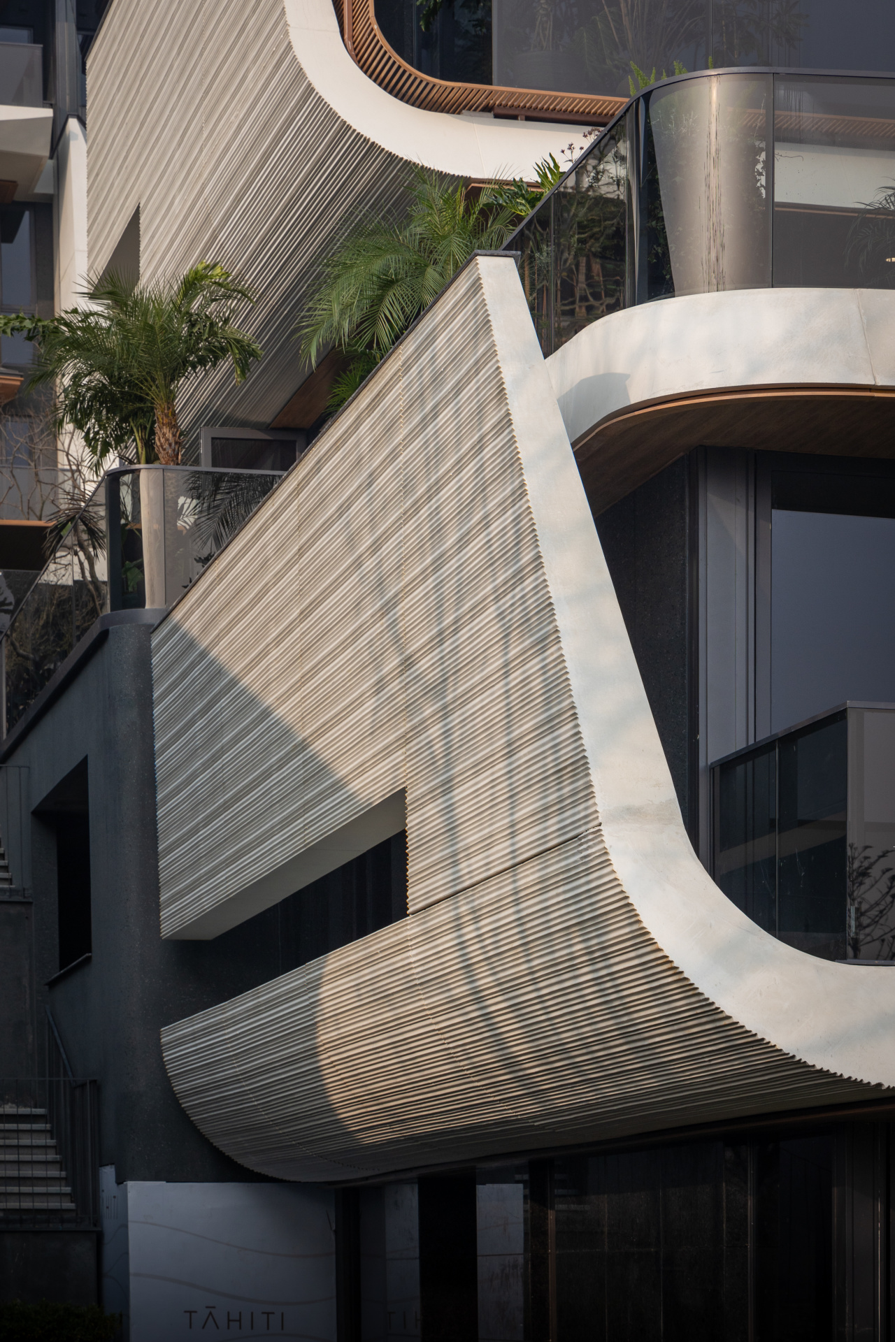 塔希提疊墅先鋒的建筑立面,通過(guò)不同材質(zhì)的合理排布設(shè)計(jì),嚴(yán)苛的施工要求,消弭了異形立面必然造成異形平面的頑疾。
