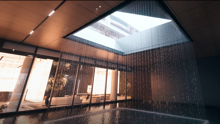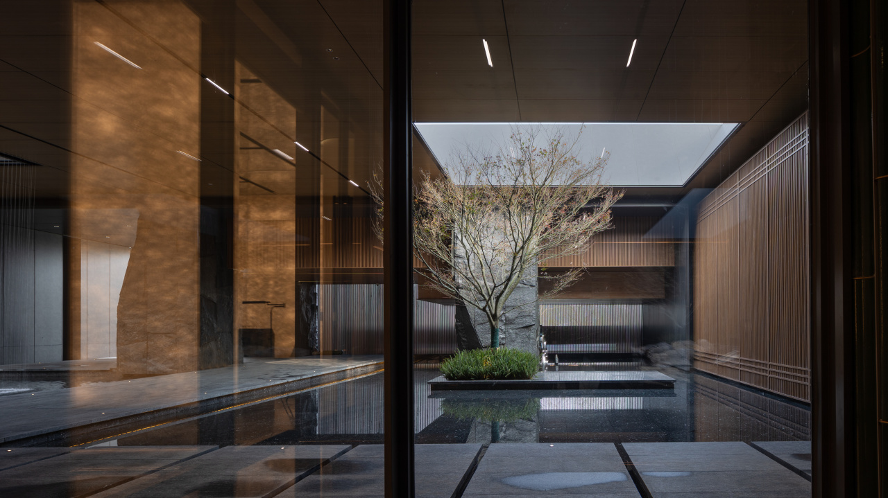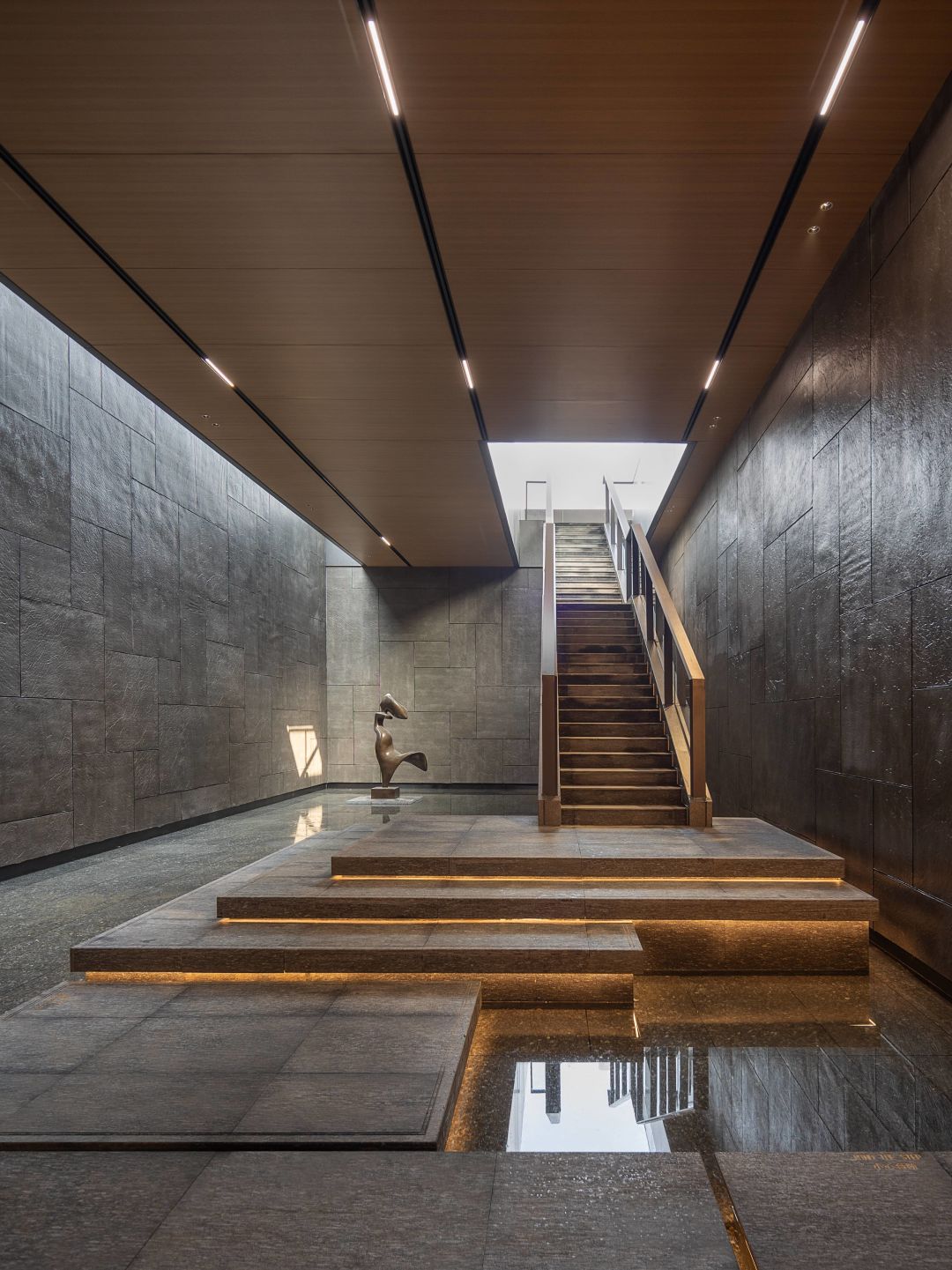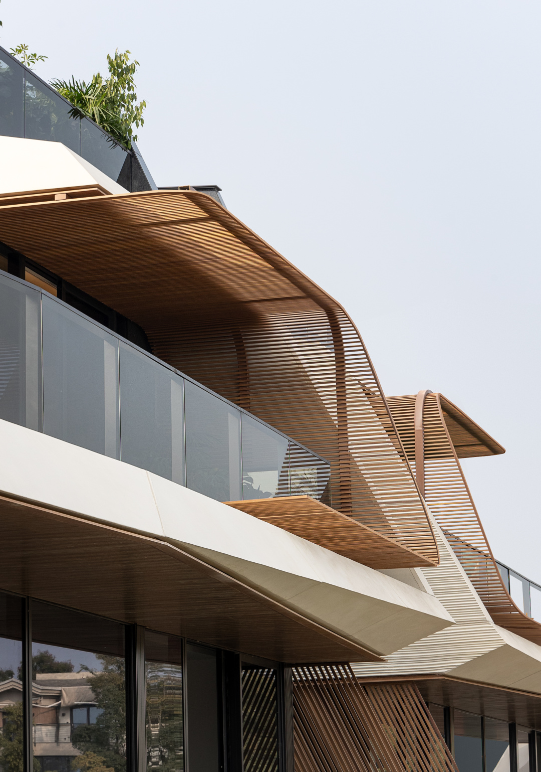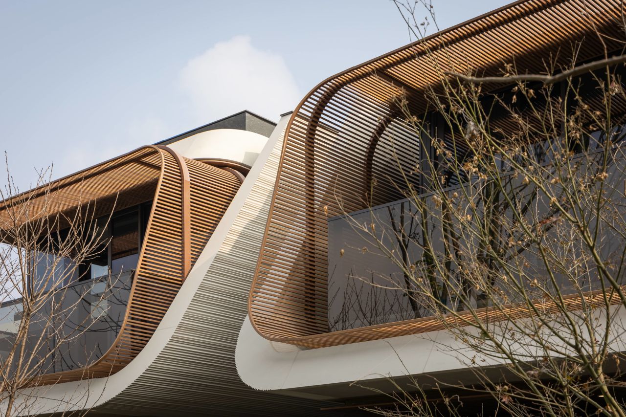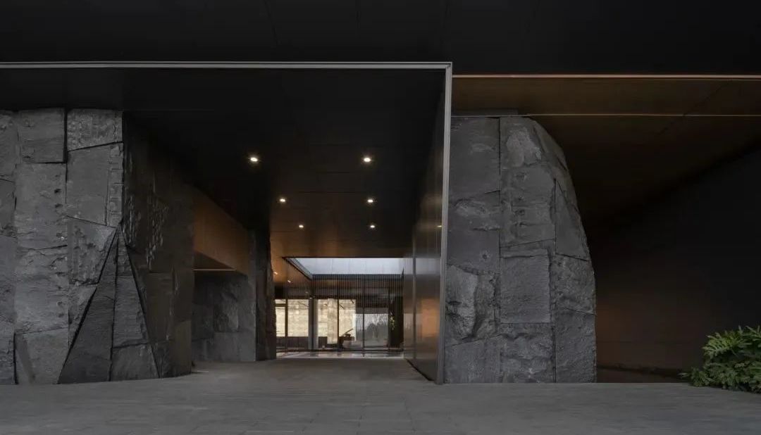 此外,外裝設(shè)計(jì)中還運(yùn)用了歐洲灰高級(jí)隱私玻璃、熱木紋轉(zhuǎn)印格柵及鋁單板、高級(jí)輥涂仿繡紋理蜂窩鋁板及鋁單板、不燃無(wú)機(jī)覆膜裝飾木紋吊頂、高性能裝飾混凝土HPC系統(tǒng)線條、仿竹節(jié)彩釉陶土板墻面、巴利白金奢石連廊、剁斧面變截面石材包柱等元素。