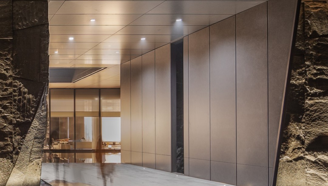 選用相同材料及工藝的還有塔希提的金屬墻面,其12mm自然縫的免打膠工藝,拼縫位置增加鋁合金凹槽細(xì)節(jié),將內(nèi)裝工藝運(yùn)用到外裝上,使立面更加精致。豎向通高金屬板進(jìn)一步提升了大堂入口空間感受。