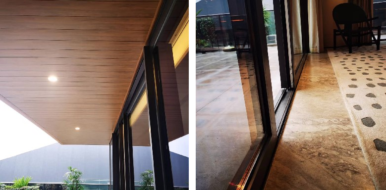 塔希提在不同材料交接位置均增加型材細(xì)節(jié),如HPC挑檐與吊頂鋁板、吊頂鋁板與墻面石材、HPC與涂料交接處均設(shè)計(jì)鋁合金型材凹槽,既能減小施工難度,也能增加細(xì)節(jié)品質(zhì)。