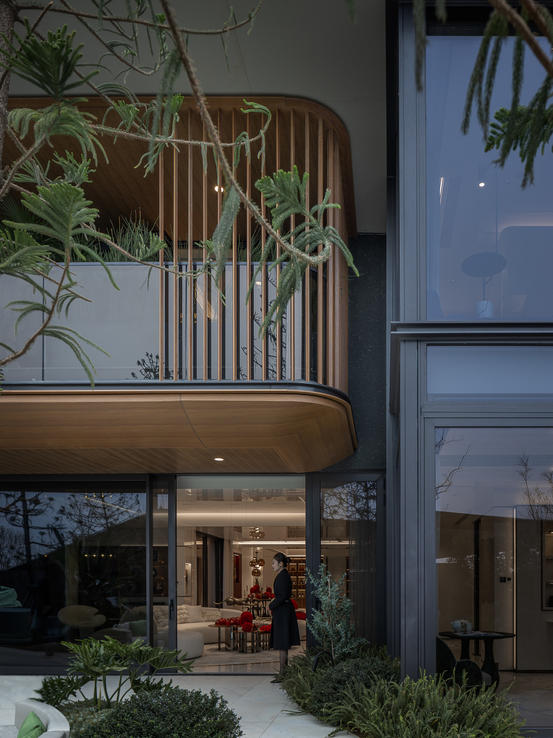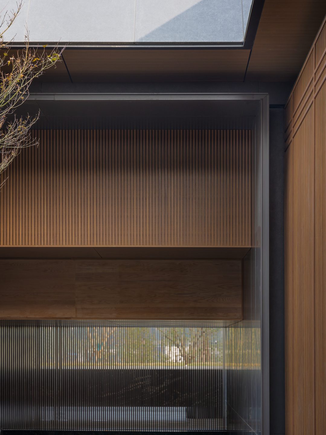 大尺寸玻璃采光面與木紋色格柵形成的對(duì)比關(guān)系,更突出現(xiàn)代與原始的對(duì)撞美。