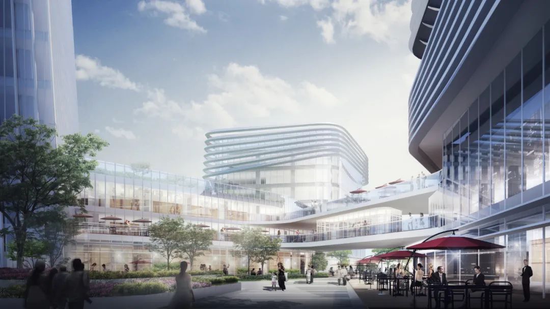 C7地塊占地面積32340㎡,容積率不超過(guò)3.0,建筑限高85m。地塊被快速路、主干道、匝道、鐵路割裂,城市界面混亂。方案根據(jù)控規(guī)條件形成體量,步行流線和南側(cè)地塊將一同打造,體塊分割成二,形成中軸線和南側(cè)地塊連軸。與南側(cè)地塊各樹(shù)立兩棟塔樓,形成完整的城市界面,朝內(nèi)院面形成退臺(tái)。最大化的享受內(nèi)部庭院,提升辦公空間品質(zhì)。打造花園體驗(yàn)式辦公空間。打造總部辦公、塔樓辦公、城市公共+社區(qū)商業(yè)為一體的三大產(chǎn)品。