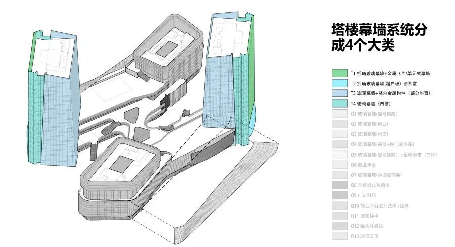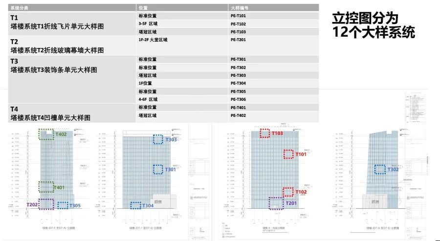 塔樓幕墻系統(tǒng)分為4個(gè)大類,而立面控制圖分為十二個(gè)大樣系統(tǒng)。
