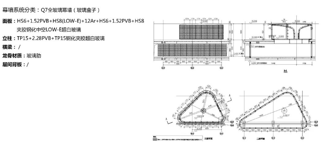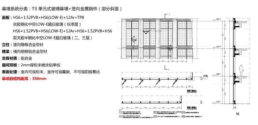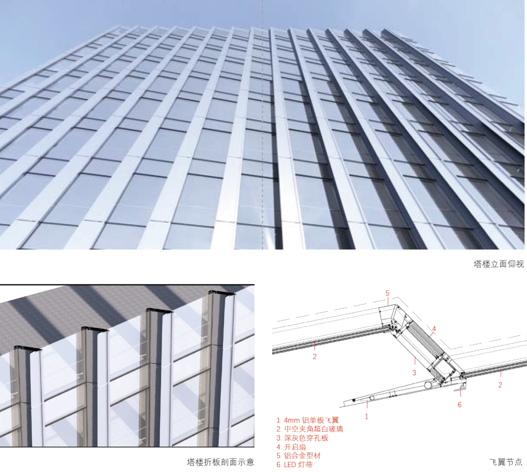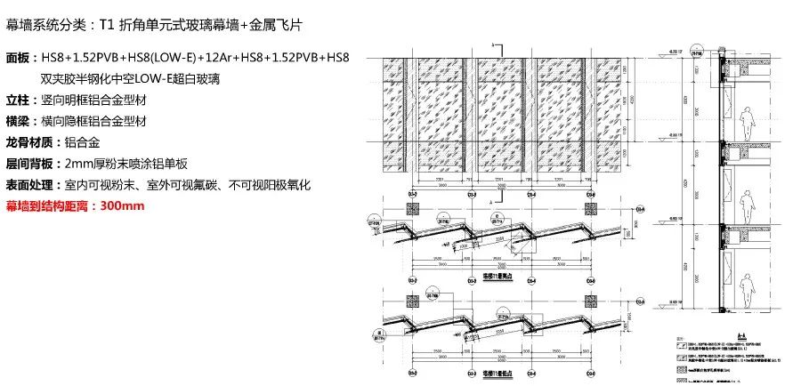 T1塔樓系統(tǒng)T1折線飛翼單元大樣圖:7F以上單元式玻璃幕墻,2~6F采用框架式玻璃幕墻。漸變的飛翼,設(shè)計(jì)新穎獨(dú)到。