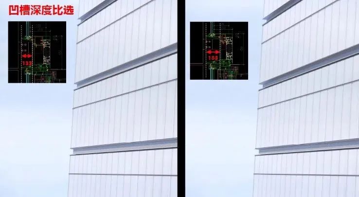 在塔樓標(biāo)準(zhǔn)段,借助T3玻璃幕墻(單元式)+豎向金屬構(gòu)件的形式,對(duì)踢腳線進(jìn)行優(yōu)化,對(duì)凹槽深度進(jìn)行比選。