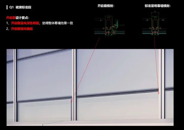 裙房標(biāo)準(zhǔn)段中,在人視角利用橫向裝飾條遮擋開(kāi)啟扇,從而保證人視高度,視線通透。