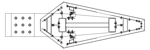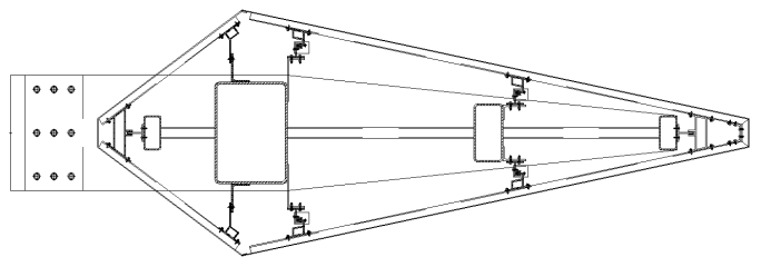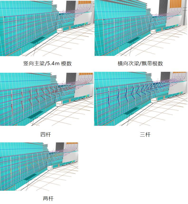 重在飄帶支撐鋼結(jié)構(gòu)設(shè)計(jì),項(xiàng)目的出彩重點(diǎn)區(qū)域。經(jīng)多輪論證,尺度較小位置采用兩桿挑出,懸挑較大位置采用三桿組合,控制桿件尺度,達(dá)到最優(yōu)的建筑效果。