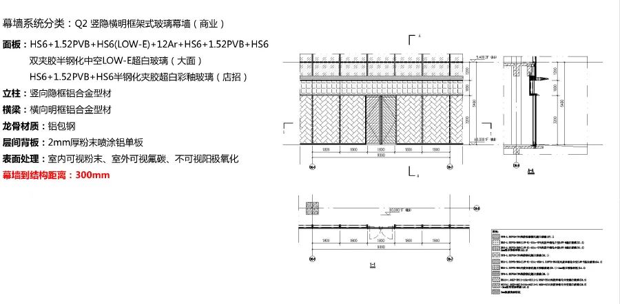 開(kāi)啟扇采用豎向深色明框,使得整體幕墻效果一致,采用橫向隱框的方式。