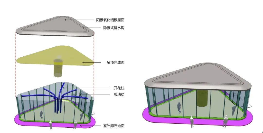 結(jié)構(gòu)支撐裝飾飄帶(不固定在豎挺上),外包鋁板形成雨棚。