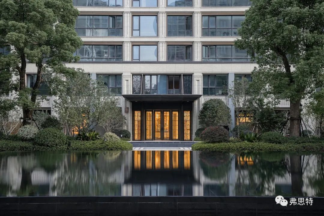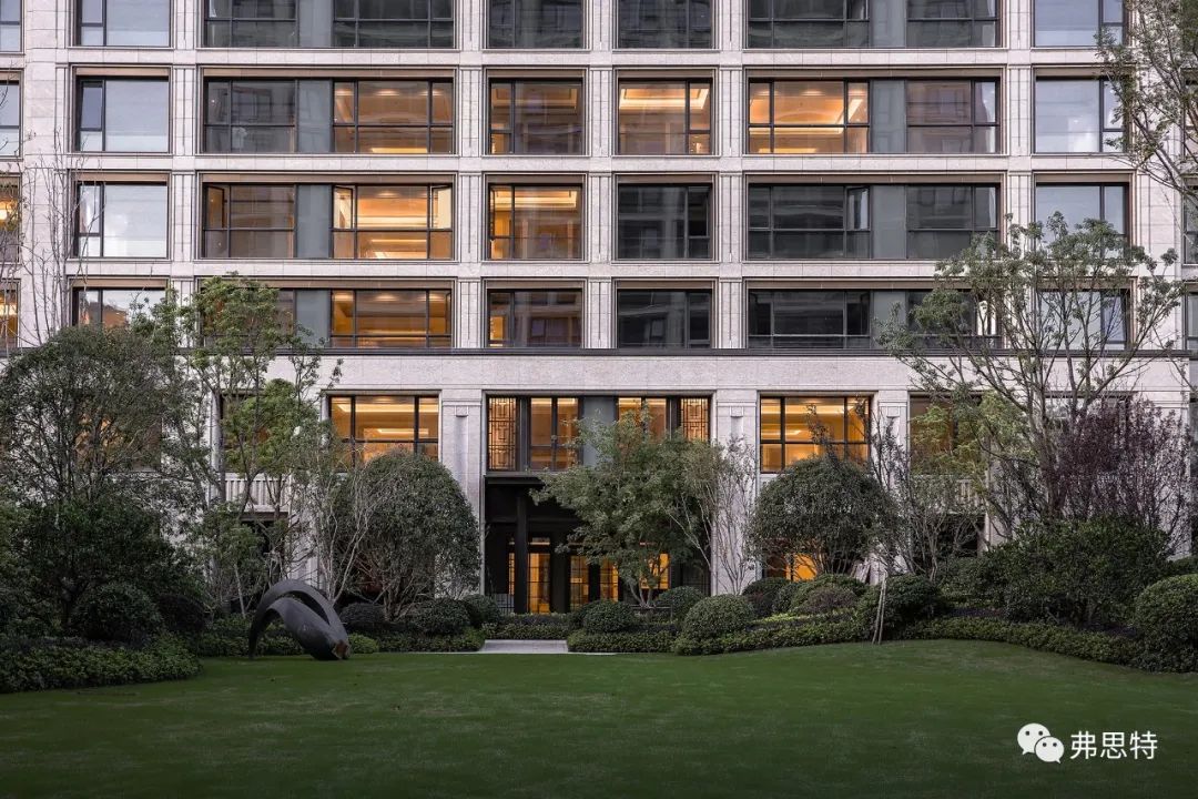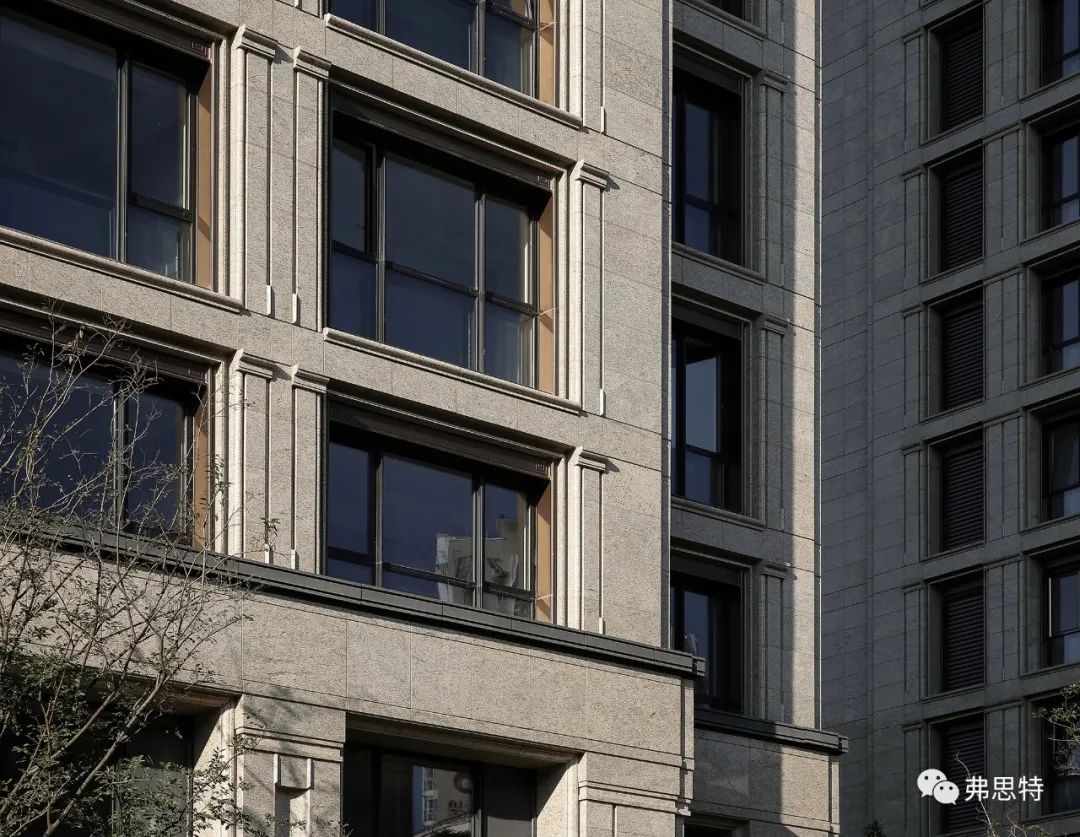 作為黃浦江沿岸的頂級高端公寓,豐富的精神內(nèi)核配合尊崇的外立面表達(dá),方能不辜負(fù)本項(xiàng)目的稀缺屬性。在外觀設(shè)計(jì)上,本項(xiàng)目采用高檔石材干掛+系統(tǒng)窗的做法,在石材與玻璃之間,新增了一個(gè)全新的金屬層次,以透亮玻璃稀釋石材的厚重,搭配質(zhì)感突出的金屬線條,三種材料于一面共生,使得外立面在透明與不透明之間無縫轉(zhuǎn)換,反映出實(shí)地場景與江景之間的微妙聯(lián)系。