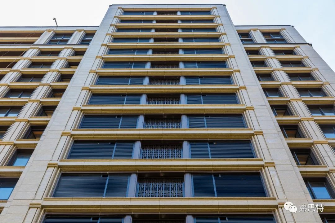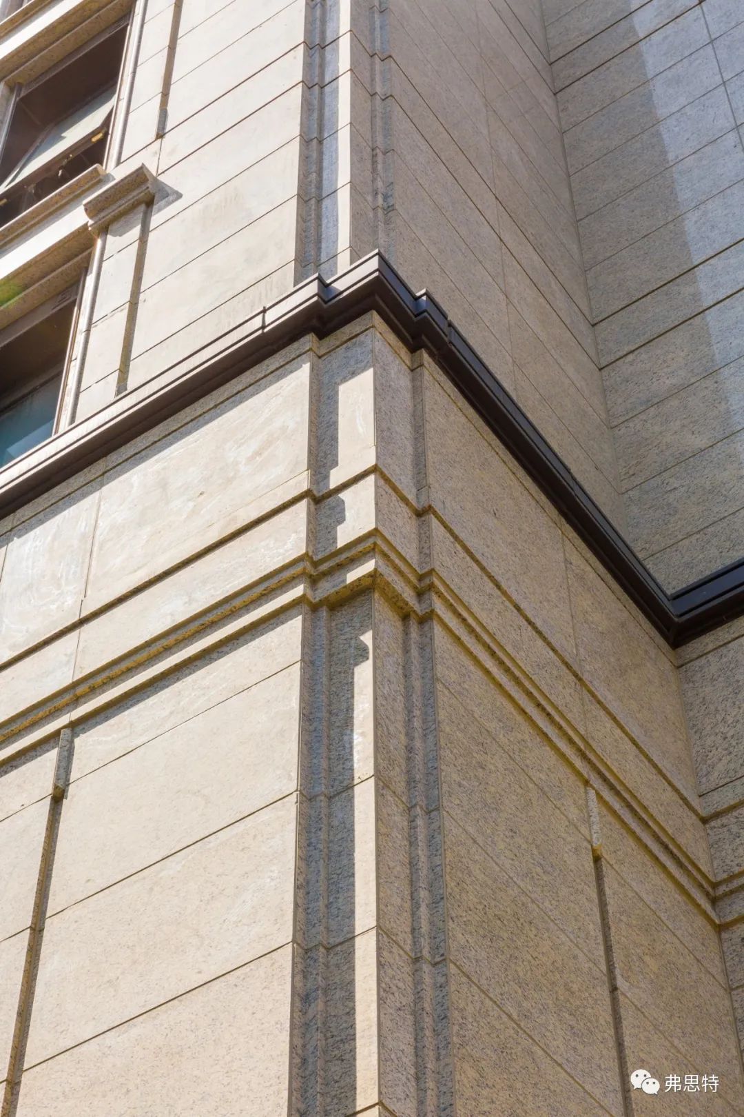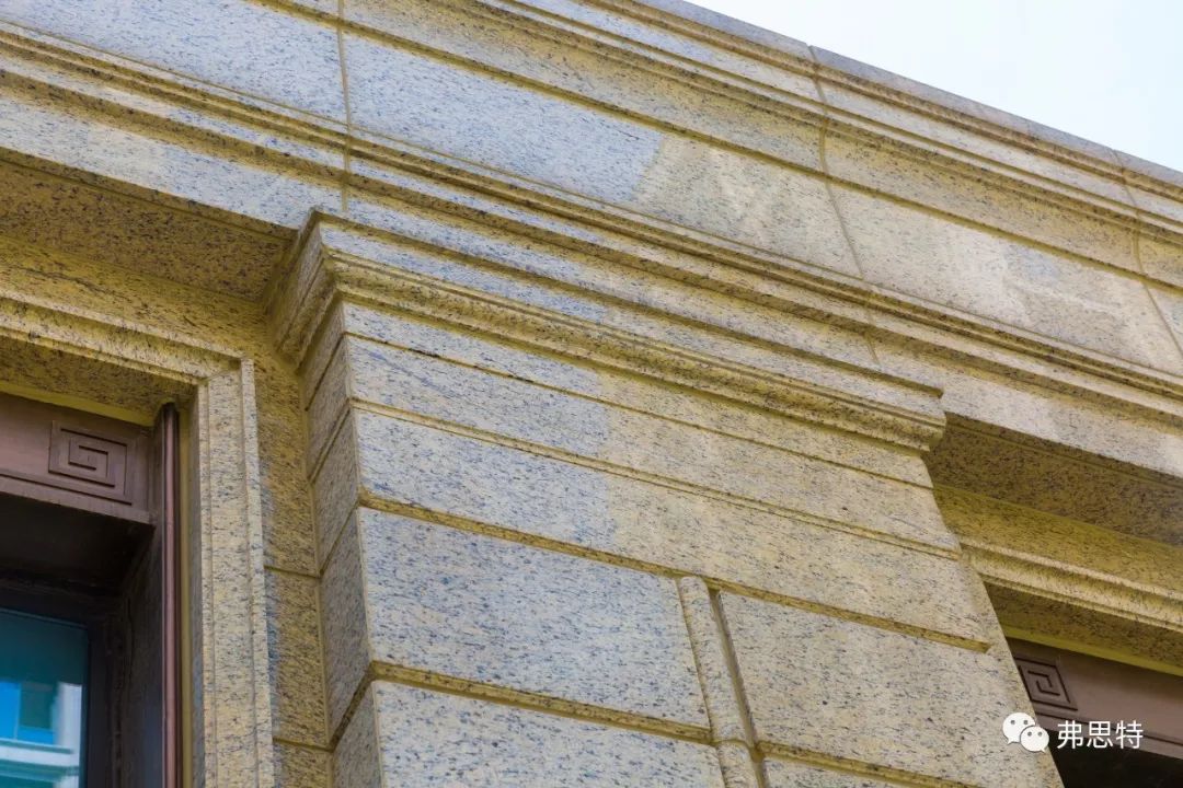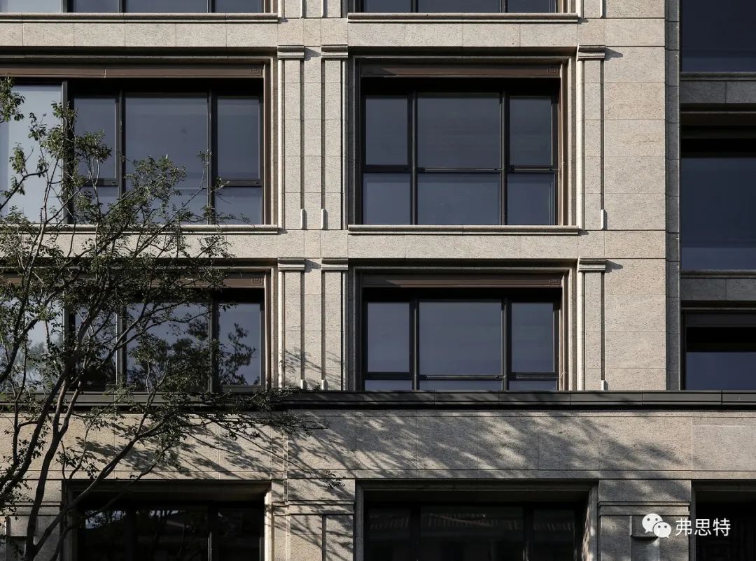 在材料選用上,主立面石材采用世貿(mào)金麻,大面積仿銅金屬線腳及窗花的點(diǎn)綴為項(xiàng)目平添一絲古典韻味。即便在設(shè)備出風(fēng)口處也做了精細(xì)化處理,在格柵上統(tǒng)一設(shè)置管道出風(fēng)口,確保整體外觀大氣簡潔卻不失風(fēng)采。