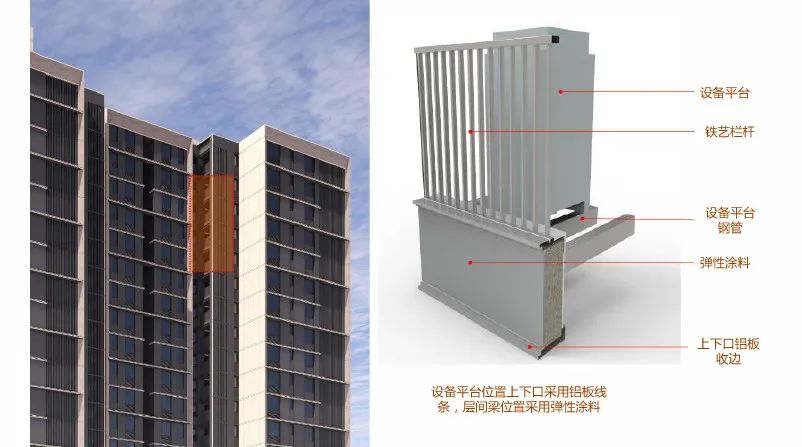 設(shè)備平臺(tái)位置上下口采用鋁板線條,層間梁位置采用彈性涂料。