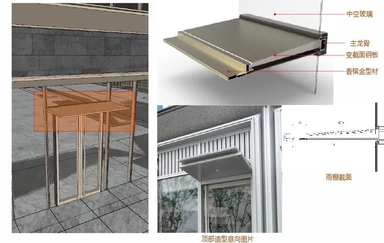 3、玻璃端頭采用香檳金色鋁板+型材的形式,保證造型的挺度。中間用鋁包鋼的形式,將雨蓬懸挑主鋼梁結(jié)合方案造型落地,保證構(gòu)架結(jié)構(gòu)合理性的同時(shí)最大程度還原了方案效果要求。