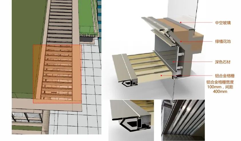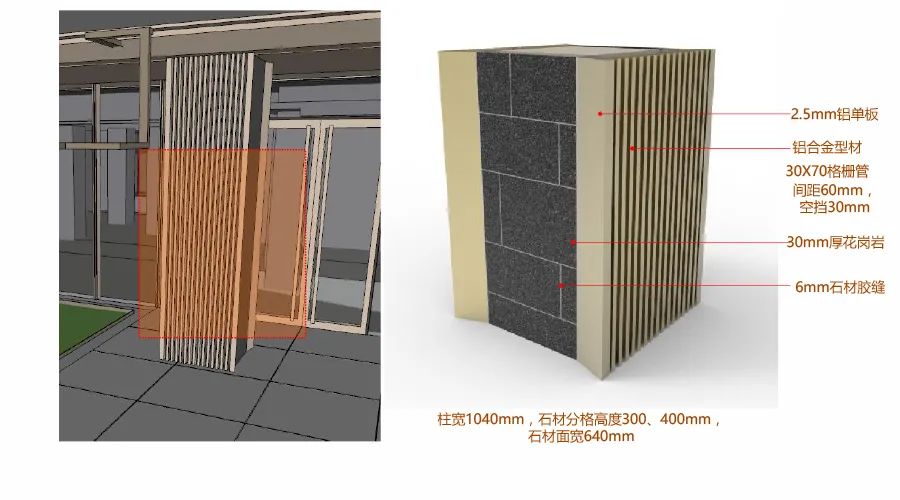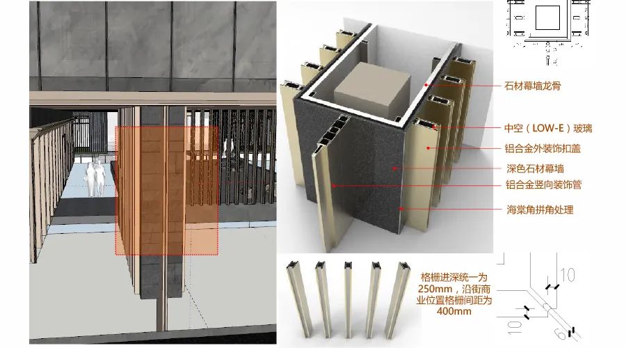 5、格柵進(jìn)深統(tǒng)一為250mm,沿街商業(yè)位置格柵間距為400mm,格柵采用石材幕墻龍骨,海棠角進(jìn)行拼角處理。