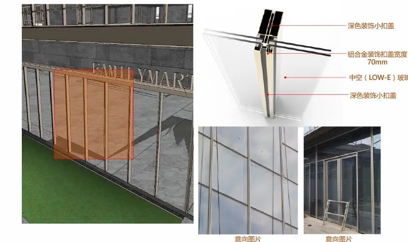 4、玻璃幕墻采用組合拼樘的子母立柱形式,外口香檳金色鋁合金型材扣蓋,并嚴(yán)控型材突出玻璃面尺寸為10mm,保證玻璃面的延續(xù)性。