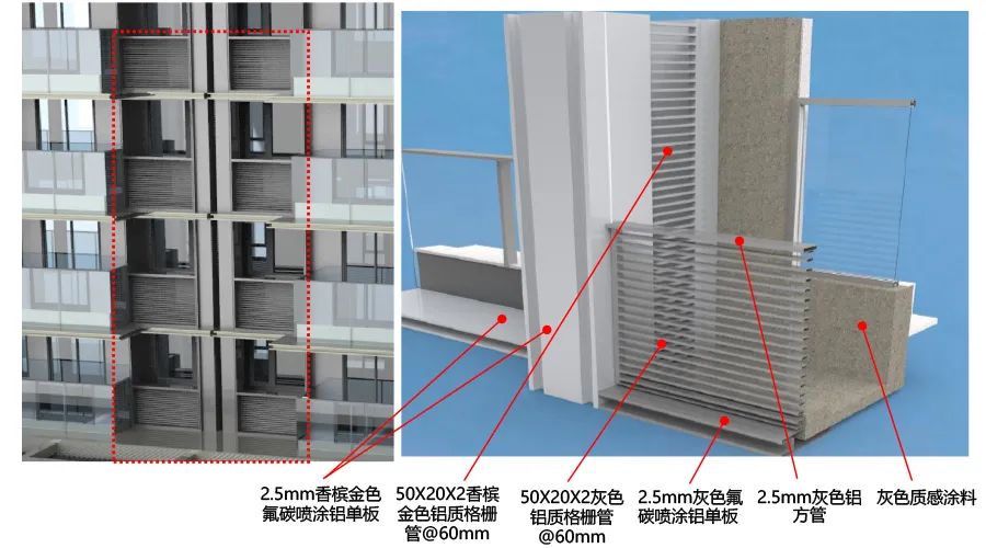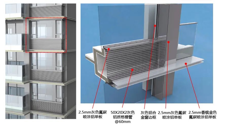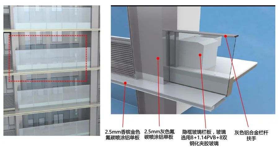 飄窗格柵:橫向格柵貫穿飄窗底部,細(xì)節(jié)精裝,飄窗內(nèi)側(cè)內(nèi)凹較多,內(nèi)側(cè)配置涂料節(jié)省成本,對(duì)立面效果影響較小。欄桿玻璃底部入槽,內(nèi)側(cè)采用涂料,欄桿采用鋼立柱作為主受力構(gòu)件,外側(cè)外包鋁合金型材,從而提升立面效果,玻璃欄桿扶手為鋁合金材質(zhì),表面可采用氟碳噴涂處,顏色均勻,色彩一致,具有金屬質(zhì)感。