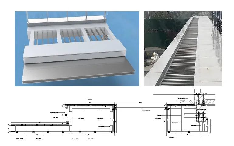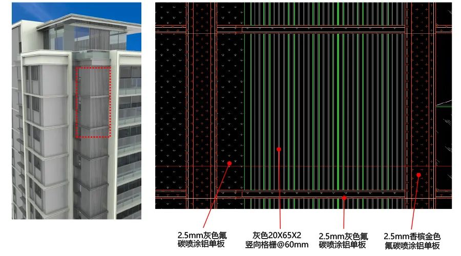 屋口位置雨棚:由2.5mm香檳金色氟碳鋁單板和2.5mm灰色氟碳鋁單板組成。格柵進(jìn)行鏤空并增加玻璃頂。豎向鋁板下部均設(shè)置滴水,避免雨水側(cè)向流通,從而污染底部鋁板吊頂,在雨棚頂部鋪設(shè)吸音棉,以減少噪音對(duì)樓上住戶的影響。