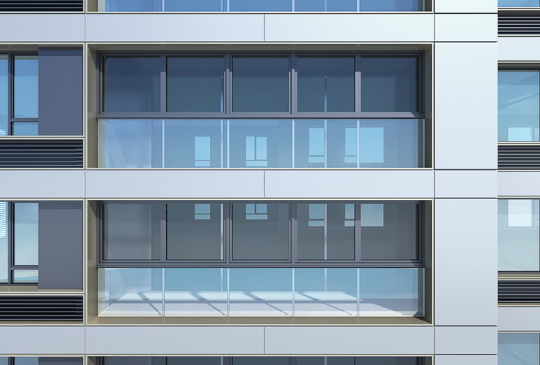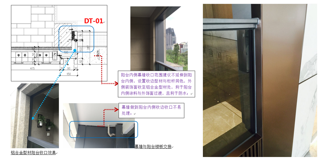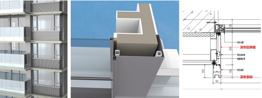 幕墻與陽臺(tái)交接部位的銜接處理關(guān)乎項(xiàng)目的總體效果,細(xì)節(jié)較為重要,常規(guī)類幕墻經(jīng)常將外立面鋁板延伸到陽臺(tái)墻體的內(nèi)側(cè)部位,導(dǎo)致近距離的觀感效果偏差,我們建議生活陽臺(tái)的部位在墻體部位設(shè)置鋁合金型材邊框,與金屬窗套顏色材質(zhì)協(xié)調(diào)。為突出邊框的折角棱角,并減少拼接處的膠縫,四周的金屬邊框采用開模鋁合金型材。