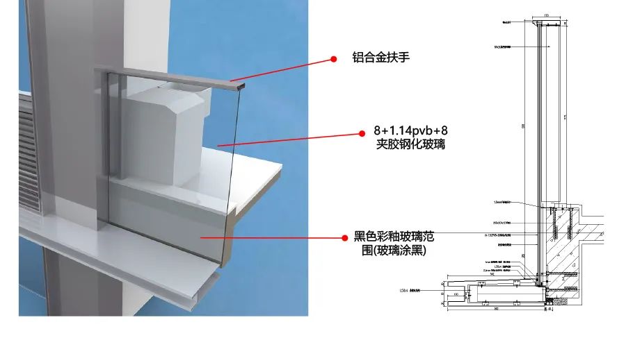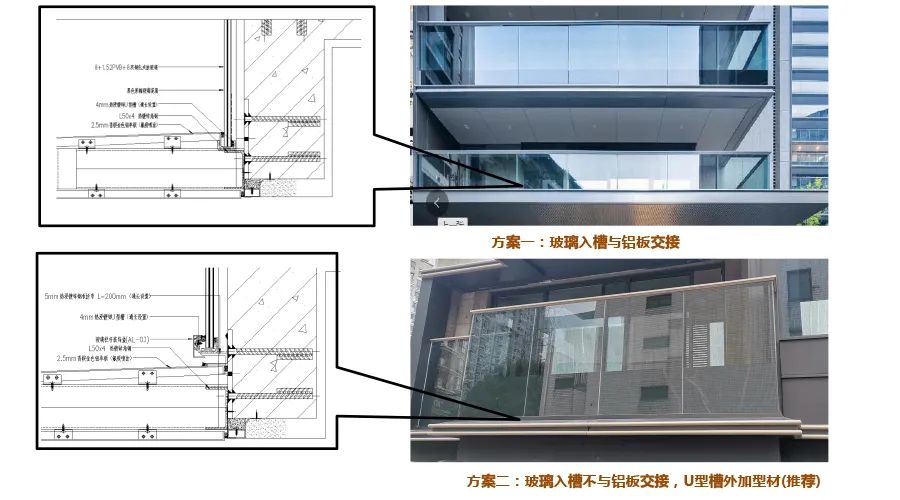 玻璃欄板:面材使用8+1.14pvb+8夾膠鋼化玻璃;立柱采用80x20熱鍍鋅鋼板。通過比選,我們建議玻璃入槽不與鋁板交接,U型槽外加型材的方式,在欄桿玻璃上鍍膜,以保證窗與玻璃的顏色相同。