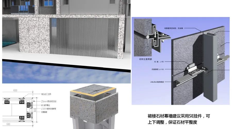 石材幕墻:北立面入口處底層一層位置由鋁板變更為光面石材,整體品質(zhì)感更為強(qiáng)烈,裙樓石材幕墻建議采用SE掛件,可上下調(diào)整,以保證石材平整度。