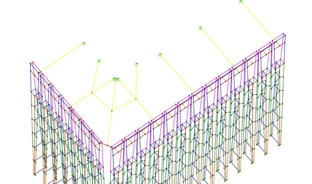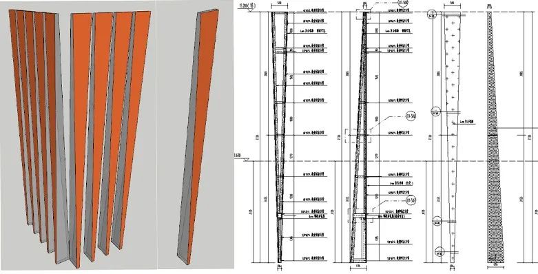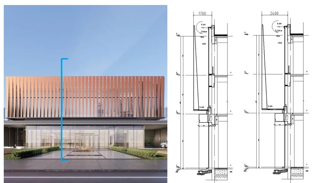 立面復(fù)合板格柵截面為漸變尺寸,立面裝飾復(fù)合板格柵距離結(jié)構(gòu)兩個(gè)側(cè)面達(dá)到了4.2米的距離,懸挑很大,格柵內(nèi)側(cè)為玻璃幕墻,格柵支撐龍骨的設(shè)置及格柵鋼架的連接需要重點(diǎn)考慮。