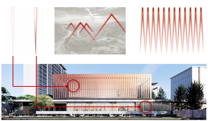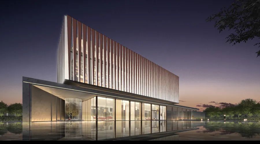 項(xiàng)目重塑唐代建筑精髓,在橫平和豎直的規(guī)律中尋找美,表現(xiàn)出一種獨(dú)特的東方韻味。通過建筑表皮的幻彩過度,“活力橙-晚霞紅-朱印紅-帝王紅”,呼應(yīng)“驪山晚照”的色彩意象,從而緊扣長安璽·東方印的文化母題。售樓處立面構(gòu)建細(xì)節(jié)提煉長安驪山巒疊置之形,統(tǒng)一協(xié)調(diào)的長條三角形元素,彼此呼應(yīng)。