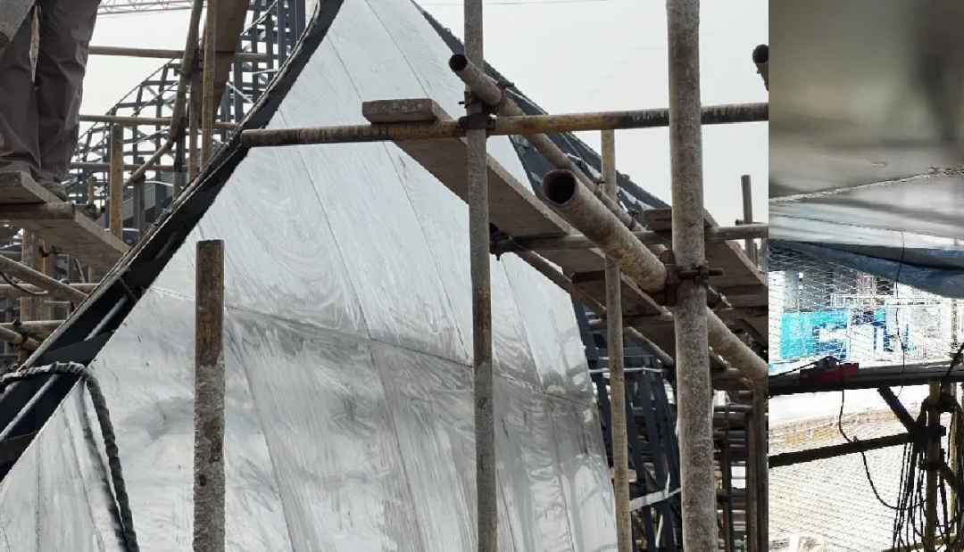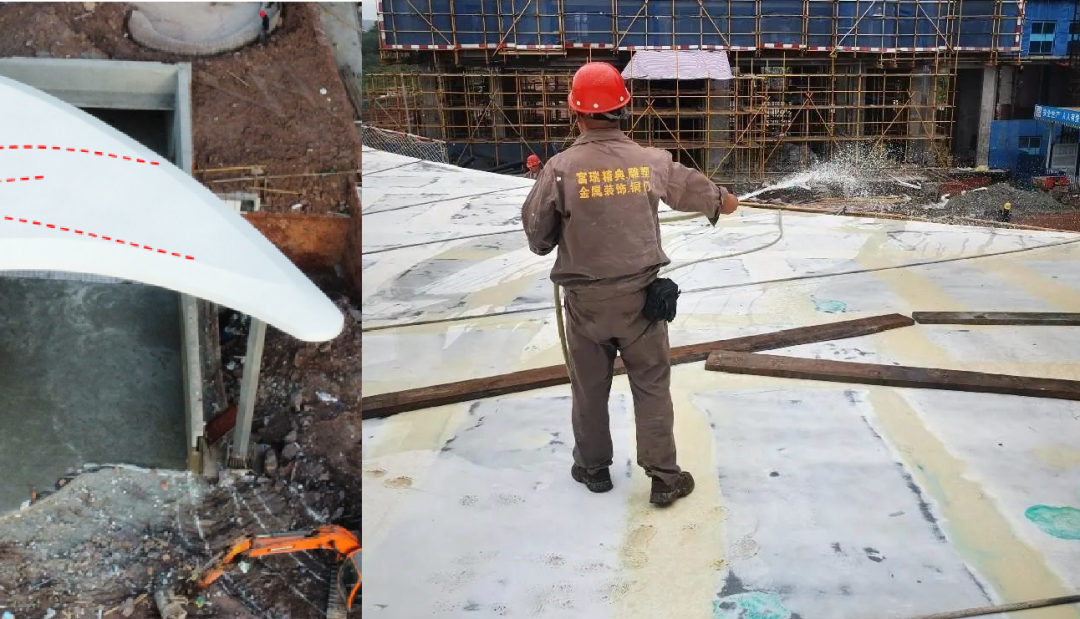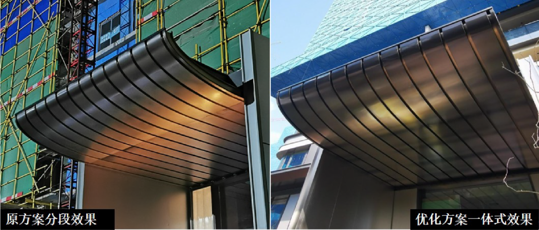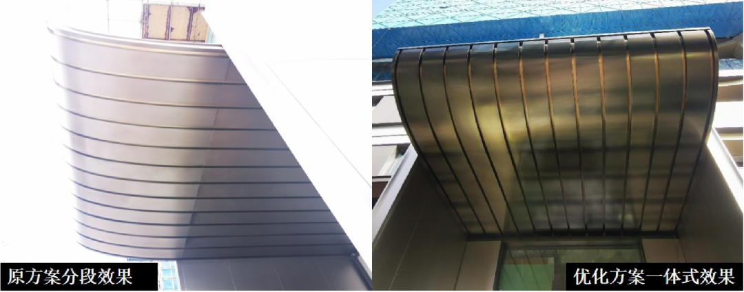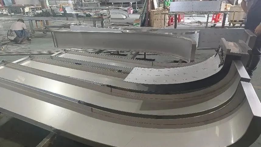 考慮到材料加工及施工難度,提前進行了1:1的工藝樣板打樣。方案選擇之初,選取了直段與弧段兩段式拼接的方案,但在實體打樣過程中發(fā)現(xiàn)顏色、密拼、縫隙等均未達到想要的效果,于是果斷放棄該方案,將直段及弧段合二為一,改為一體式不銹鋼。這樣不光增加了成本,還極大的增加了材料生產(chǎn)、運輸、安裝過程的難度,但最終效果卻更完美,100%還原無縫、無膠、密拼效果,復(fù)刻船頭造型。