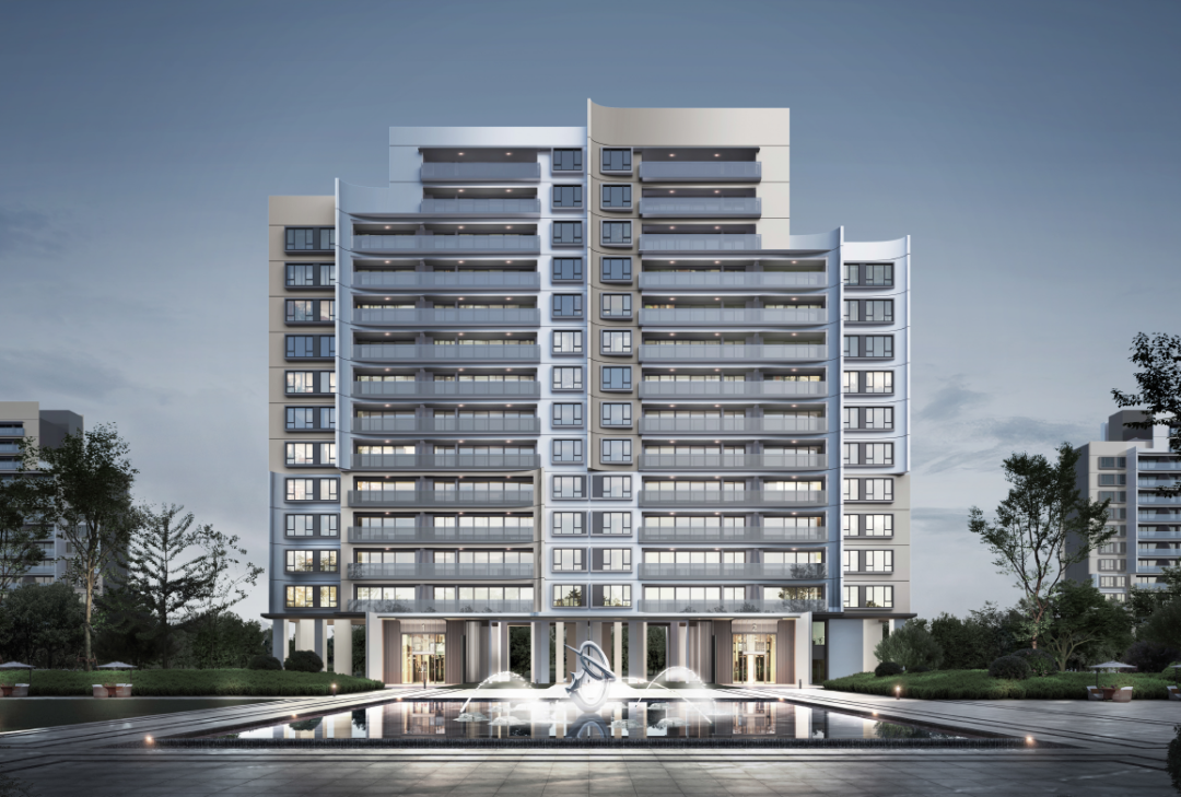 住宅樓立面以鋁板幕墻、玻璃欄板為主要形式,以表現(xiàn)建筑體本身的通透明凈之感,配以風(fēng)帆鋁板造型傳達其飄逸的氣質(zhì),塑造靈動立體的建筑形象。隨人行視角的不斷變化,展現(xiàn)不同的視覺效果。材質(zhì)方面則選用大面積鋁板,使得建筑整體風(fēng)格協(xié)調(diào)一致,白色、香檳色鋁板融合交錯,形成和諧靈動的色彩搭配。