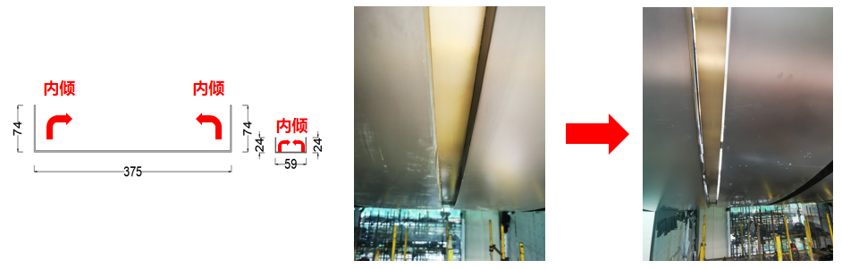 6.7m+6.2m通高不銹鋼線條左右分布(國內(nèi)最大刨槽機可生產(chǎn)8m),線條的設(shè)計仍維持萬華對于完整性強迫癥似的的追求,放棄原3段式的方案采用整體線條,每塊不銹鋼需折邊8次。因板幅過大,加工過程中需將兩臺設(shè)備合并后才能進行剖槽,極大的增加了加工成本、生產(chǎn)周期以及運輸、安裝難度。