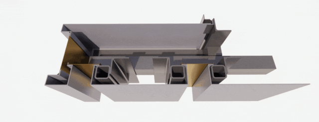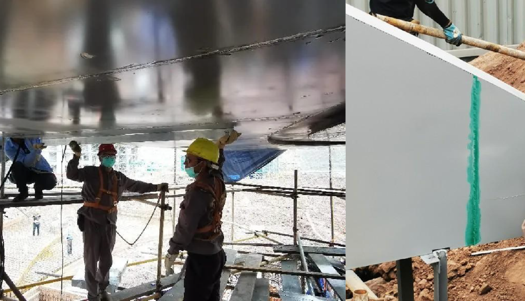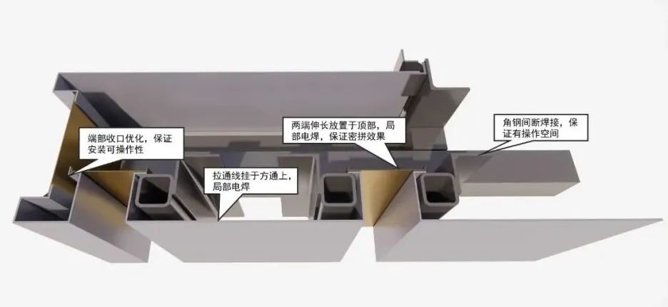 同時為保證吊頂兩端不銹鋼側(cè)面整體效果,即便是在客戶非敏感區(qū)域內(nèi),仍堅持采用不留縫、不留膠的效果,采用3D建模,將底部、頂部、側(cè)面三面焊接為一體,單塊板焊縫達20條以上,最后整體打磨鍍色成型。