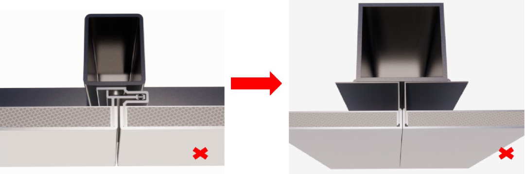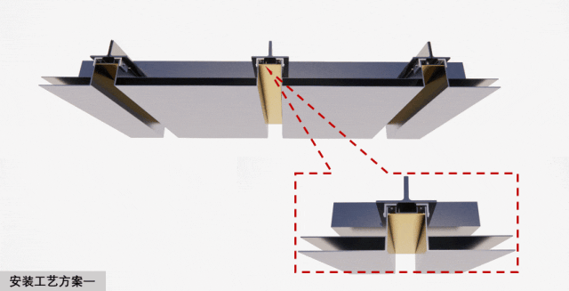 為保證密拼效果,在折邊插掛、飛邊硬拼、焊接密拼、掛接等方案中反復(fù)試驗對比,最終選用蜂窩鋁芯專用背栓,在蜂窩芯內(nèi)提前種釘打孔,保證安裝工藝的可行性與便易性,并輔以背側(cè)拼接處點焊方式固定,保證密拼效果。