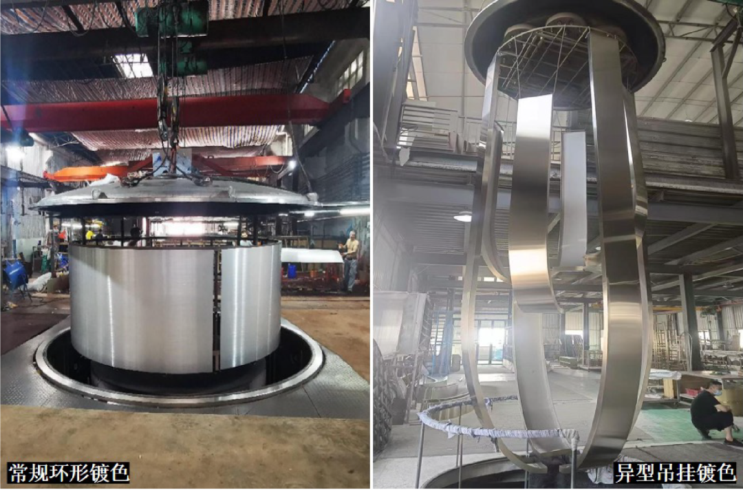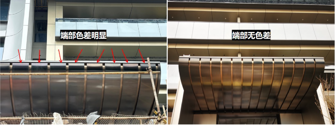 不銹鋼正常電鍍工藝是圍繞環(huán)形鍍色爐開展,這樣電離子反應(yīng)相對平衡,鍍出來的顏色也比較均勻。但因吊頂板尺寸過大且為異形板,已接近電鍍爐極限,無法采用環(huán)形鍍色方案,只能采用吊掛方式電鍍。在電鍍過程中,不銹鋼端部因過于接近電鍍爐底部,在重力作用影響下,下部電離子在不銹鋼端部位置反應(yīng)不均勻,導(dǎo)致不銹鋼電鍍后端部有色差,即便是同一爐生產(chǎn)也會有色差(目前國內(nèi)廠家無法攻克該技術(shù)難題)。為解決色差問題,多方聯(lián)系不銹鋼廠家、油漆廠家、技術(shù)專家,現(xiàn)場反復(fù)試驗對比,最終采用特殊封油工藝,完美的解決了端部色差問題。