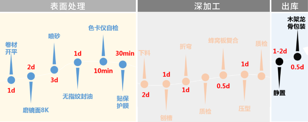為保證平整度,萬華精益求精,板材選用25mm厚蜂窩不銹鋼板(1.5mm不銹鋼+22mm蜂窩芯+2mm鍍鋅背板),蜂窩不銹鋼板自散材表面處理、工廠深加工至最終出庫,需10~15天的時間,保證質(zhì)量,力求完美。